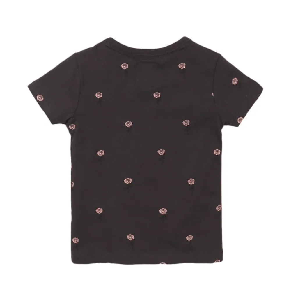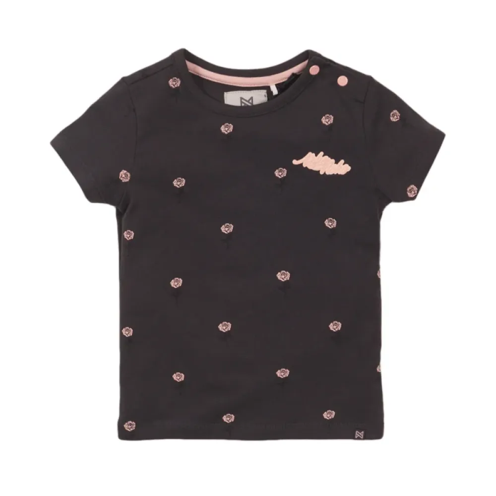 Koko Noko meisjes T-shirt donker grijs roos. Het shirt is donker grijs van kleur en heeft korte mouwen. Het heeft een lieve roze roosjes print die verdeeld is over het hele shirt.