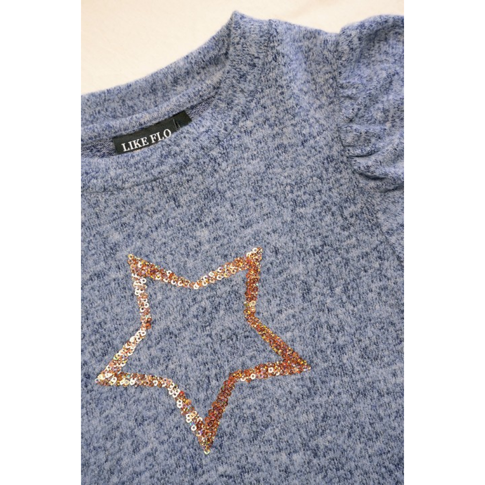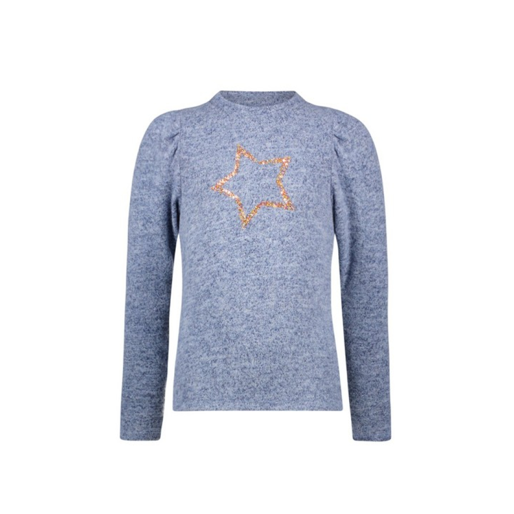 Deze heerlijke zachte jersey mêlee top ELEAH is the BOMB! De zachte stof is licht opgeruwd waardoor hij een super zachte touch krijgt. Hij heeft hippe puffy sleeves en is gemaakt in een prachtige jeans blauwe kleur. Hij is afgewerkt met een luxe pailletten ster.